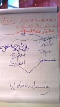 Frau Schleinich zeichnet auf dem fünften Blatt des Flipcharts auf wie sich die Schriftsprache und die Lautsprache entwickeln. Auf der Basis der Wahrnehmung (5 Sinneskanäle spüren & Gleichgewicht & riechen/schmedcken & hören & sehen und deren Verarbeitung) läuft der Input über die Augen und über die Ohren gezielter weiter. Über die Augen nehmen wir Bilder, Symbole, Buchstaben und Wörter wahr, über die Ohren nehmen wir Stimme, Töne, Laute auf. Es entwickelt sich aus diesem Input die Lautsprache und eine Vorstellung von Schriftsprache. Ab dem Niveau der Schulfähigkeit greift unser Bildungssystem und holt die Kinder hier ab, um ihnen das Lesen und Schreiben in der Schule beizubringen.