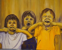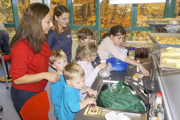 Frau Schleinich zeigt uns ein Bild, drei Kinder die Grimassen schneiden. Die erste Aufgabe für die Zuhörer besteht darin, einen Satz über das Bild aufzuschreiben. Eigentlich eine klare einfache Aufgabe, die man leise erledigen kann. Trotzdem steigt wieder der Geräuschpegel im Saal deutlich an.