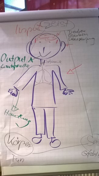 Auf dem dritten Blatt des Flipchart entsteht ein gezeichnetes Menschlein mit Ohren, Augen und Konturen. Kleine Pfeile deuten Input und Output über verschiedene Kanäle an. Die Ohren, die Augen, die Haut.