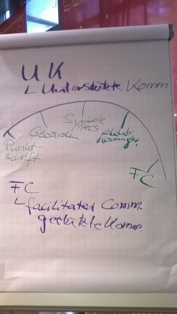 Hier kommt UK ins Spiel und das vierte Blatt auf dem Flipchart erhält einen großen schwungvoll gezeichneten Bogen, eine Art Dach. Unter diesem großen Dach für Unterstützte Kommunikation siedelt sich an die Punktschrift für Blinde, Gebärden für Gehörlose, Symbole, elektronische Kommunikationsgeräte und die FC.