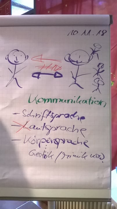 Ein neues Blatt am Flipchart wird aufgeschlagen und Frau Schleinich zeichnet Strichmännchen, deutet die Interaktionen der Kommunikation zwischen diesen mit Pfeilen an.