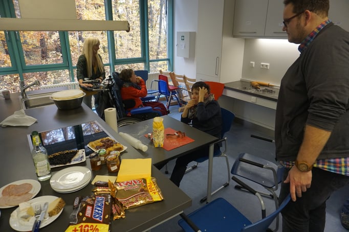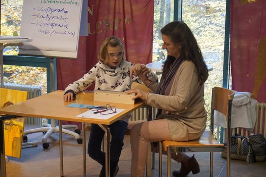 Kinder mit Rett-Syndrom sind oft körperlich überfordert und kognitiv unterfordert. Um sie hinsichtlich der Schriftsprache zu fördern, können wir ihnen körperlich helfen (mit der Stütze) und ihnen geistig mehr Input geben. Um ihr Interesse zu wecken. Denn wie es die Mutter selbst schon ausdrückt, ihre Tochter sei mit 10 Jahren von den ewigen Symbolen gelangweilt. Frau Schleinich bestätigt, dass das verständlich sei und dass nun die Buchstaben neues Interesse bringen könnten.