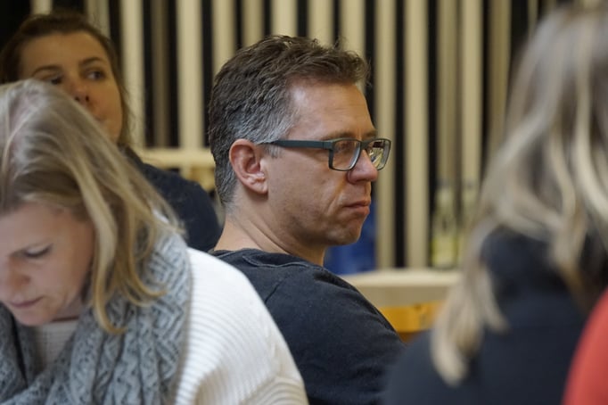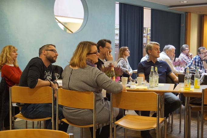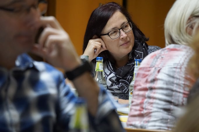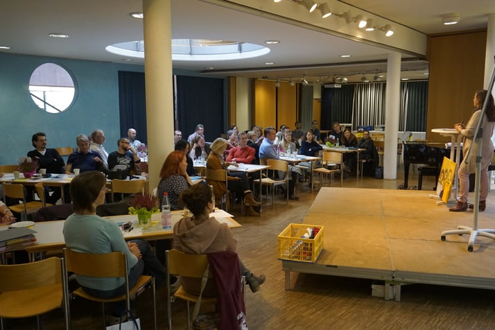 Frau Schleinich betrachtet ihr rund 42 Personen umfassendes Publikum und möchte wissen, warum wir hier sind.